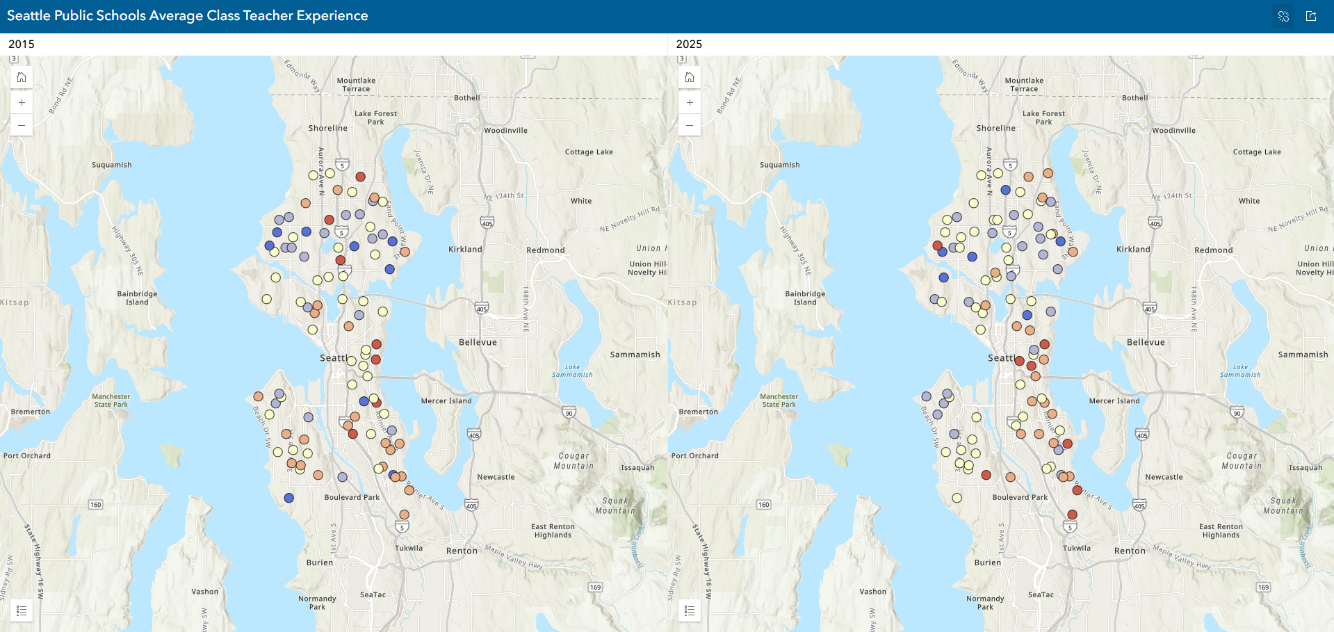 Map displays teacher experience in 2015 and 2025 to aid Seattle Public Schools advocates and decision-makers in understanding geographic trends over time in teacher experience.